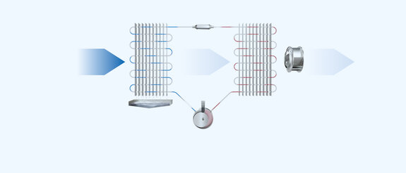 The air is cooled, water vapor condenses, and moisture is removed from the air.