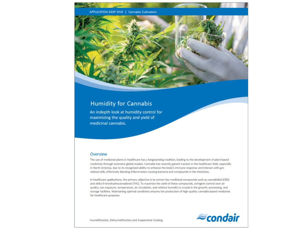 Condair humidity control solutions ensure precise humidification and dehumidification to maintain optimal conditions for cannabis cultivation. Stable humidity levels support healthy plant growth, prevent mould and disease, and enhance cannabinoid and terpene production. Consistent environments improve yield, quality, and overall cultivation efficiency.
