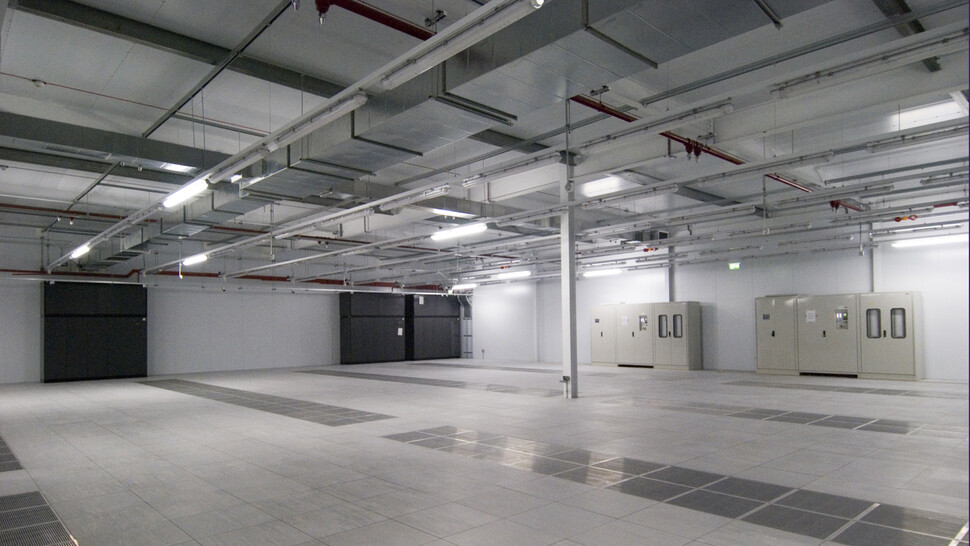 Once the cold outside air is brought into the building, it is mixed with hot air re-circulated from the data halls, raising the temperature but reducing its humidity. 78 spray and evaporative humidifiers then add up to 22,800 litres of water per hour to the air stream flowing through the building’s “penthouse ventilation” systems. This produces the ideal humidity while lowering the temperature back to the required supply condition for introduction to the data halls.