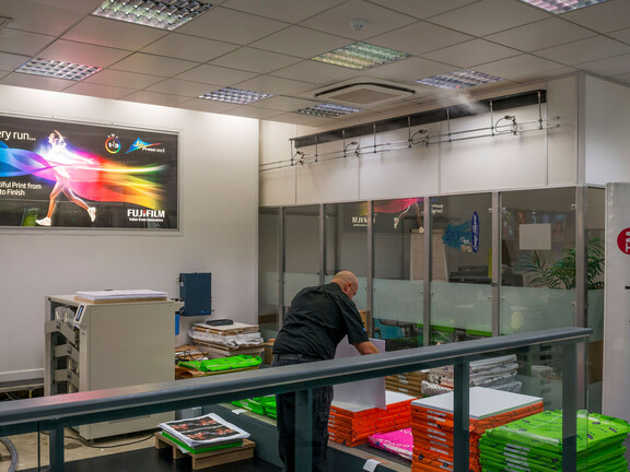 Steve Freeman, Jet Press Solutions Manager at Fujifilm “Humidity control is important for paper handling consistency when running lighter weight stock on the Jet Press 720S in both the feeder and jetting area. We aim to maintain an RH of between 40% and 60%. Below this could potentially cause an increase in paper handling issues on light weight paper”. Since the installation of the Jetpray, Steve said, “Once the humidifier was up and running correctly, it has performed well. It now easily and quickly gets the room up to the required RH and maintains this after start-up”.