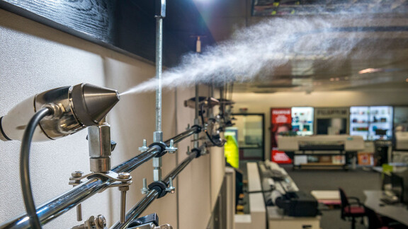 The JetSpray humidifier consists of a control panel feeding compressed air and water to rows of self-cleaning spray nozzles mounted in the area to be humidified. The compressed air atomises the water as it is released from the nozzle, creating a very fine aerosol that rapidly evaporates. The nozzle design ensures that water can only be introduced when compressed air is flowing, guaranteeing drip-free humidification. The system has a fully modulating output and offers very close humidity control at ±2%RH.