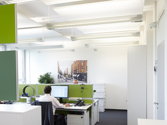 By moving to the Munich location, Amundi Germany offers its employees and customers high-quality premises: ceiling sails and an acoustically effective carpet serve as sound absorbers and ensure modern room furnishings and workplace design with automatic glare devices. Immediately after moving in in the summer of 2012, however, the first requests from employees were made to do something about the increasing complaints caused by the very dry indoor climate. The measurement of the humidity in the offices showed a relative humidity of only 11 – 23 %.