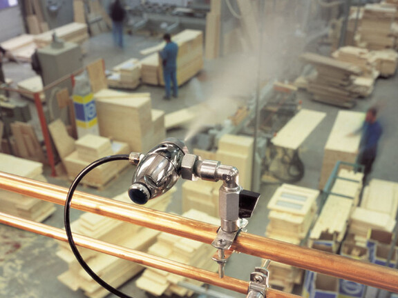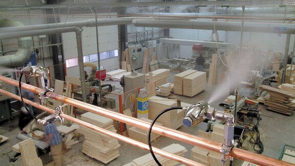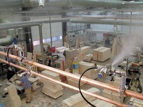 Wood is by its nature hygroscopic - that is it is affected by the moisture content of the atmosphere surrounding it. In order to avoid the warping and swelling that occurs when it is exposed to different humidities an optimal humidity level must be consistently maintained. Cold water spray humidifiers have the added benefit of suppressing dust in the atmosphere, which in an environment where wood is being sawn, is very desirable and results in the area being a much healthier and nicer place to work in.