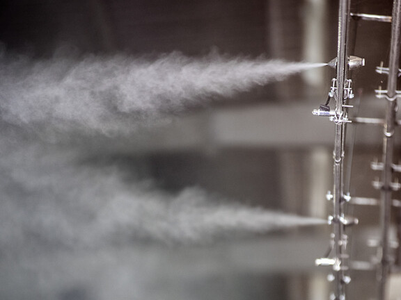 The JetSpray humidifier consists of a control panel and a series of nozzles, which can be mounted throughout the area to be humidified, as well as on the in-duct manifold, as a retrofit replacement of the CFM’s original, inefficient in-duct humidifier. The precision engineered nozzles combine compressed air and water, which when released create a very fine and highly directional aerosol. The compressed air ensures the moisture rapidly evaporates without any risk of wetting in the area or on machinery within the room. The fan-free design means the JetSpray can operate in very industrial, dusty environments without problems. The nozzles have a self-cleaning mechanism that prevents blockages and the humidifier can operate with any potable water quality without the need for highly filtered, mineral-free water.