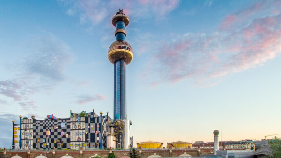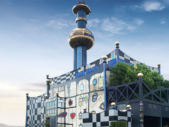 The most distinctive of all of Vienna’s Hundertwasser buildings is the district heating plant in Spittelau. The building houses one of three thermal waste treatment facilities operated by the company Fernwärme Wien GmbH, and was built in 1971 for the main purpose of heating the “New General Hospital,” situated some 2 km away. The giant tower with its golden orb, which can be seen from almost every high point in the city, is characteristic of the artist Friedensreich Hundertwasser.