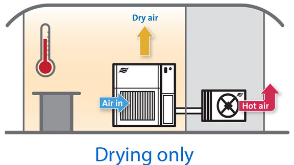 An alternative to adding AC, is to use a condensing dehumidifier with a remote condenser. Dehumidifiers, such as the Condair DC-N, incorporate a secondary condenser, that can eject the refrigerant circuit heat outside, similar to a split AC. If the room temperature is lower than the required level, the integrated condenser will provide heat to the room when drying. When the temperature level is reached, the external condenser is activated, avoiding any overheating of the area during the drying process.