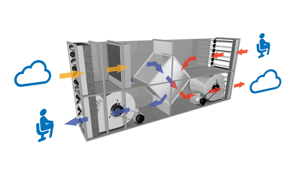 This strategy uses the outside air to cool an internal environment, without allowing external and internal airstreams to directly mix. Cool outside air is drawn through a heat recovery unit then immediately exhausted, while internal air is drawn from the room and circulated through the heat recovery unit before being re-introduced to the room. The outside air’s cool thermal energy is thus transferred to the internal air via the heat recovery unit without the two streams directly mixing.