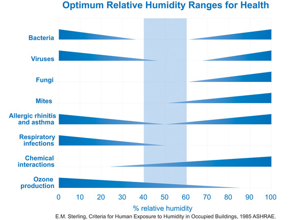 The lowest health risk from viruses, bacteria and mould is a mid-range humidity.