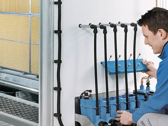 With adiabatic (cold water) humidifiers the most important service requirement is related to hygiene rather than scale management. A maintenance schedule should be in place to meet current HSE regulations on water quality by regular water testing and sampling. Without this control, there is an increased risk of the system developing Legionella bacteria and the resulting danger that this presents.
