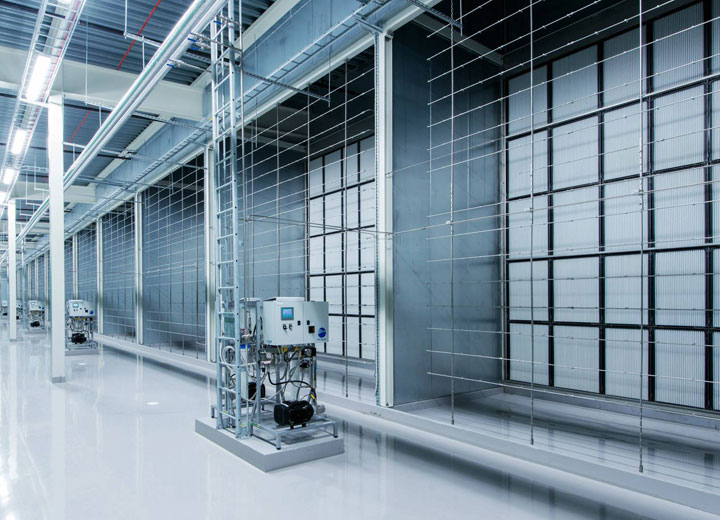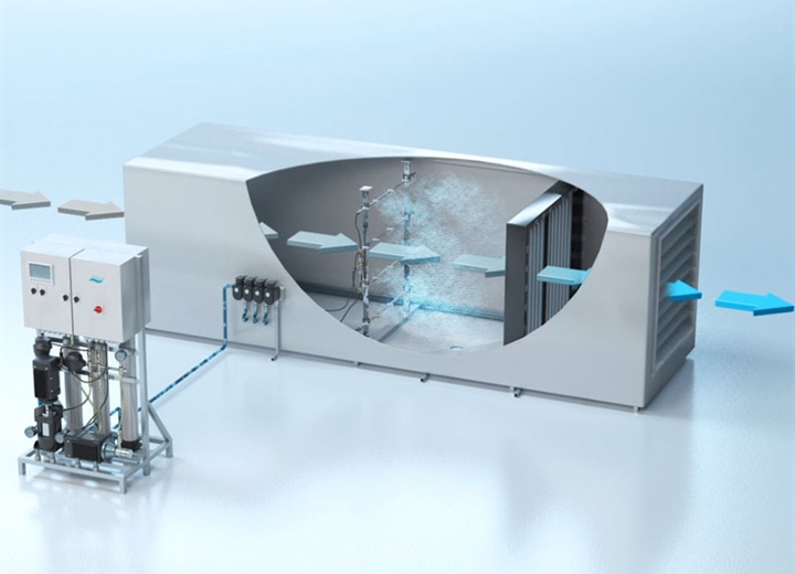 The nozzle lines are connected to a high pressure pump station and a water treatment system. Minerals are removed from the supply water before it is provided to the nozzle lines at between 60-70bar. A single pump station is capable of supplying nozzle lines in multiple AHUs with up to 1,300kg/hr of moisture. The system has a high humidification capacity and offers up to 884kW of adiabatic cooling from just 2.2kW of consumed electricity.
